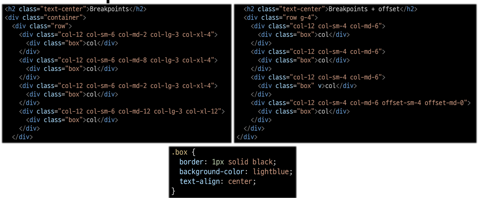 ⎣ 오른쪽 이미지의 offset-sm-4는 sm사이즈일 때 4칸, offset-md-0는 md사이즈일 때 0으로 바꾸면 offset 해제가 된다(=원상태로 돌아간다)