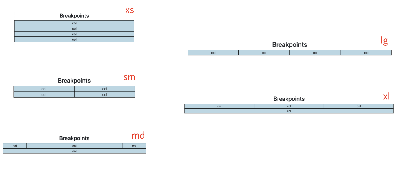 - 화면 너비에 따라 6개의 분기점 제공(xs, sm, md, lg, xl, xxl)
