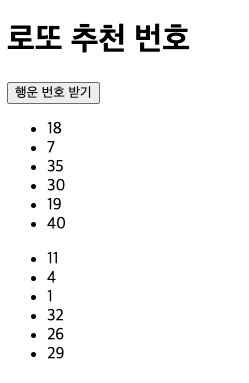 - '행운 번호 받기' 버튼 누를때 마다 6개의 번호 생성