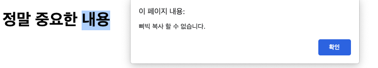 - 텍스트를 복사하려고 하면 알림 창을 띄우면서 복사를 중단하기