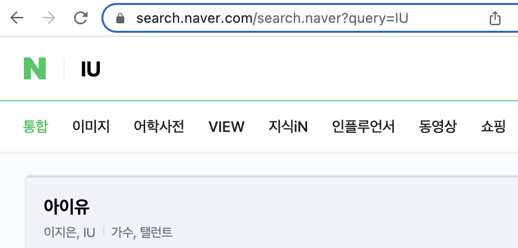 ex1) https://search.naver.com/search.naver?where=nexearch&sm=top_hty&fbm=1&ie=utf8&query=IU IU를 검색했을 때 나오는 네이버 URL주소인데 key=value 형태로 이루어져 있다는 것을 알 수 있다(파란색 이후 부분) query는 네이버 서버에서 검색어를 확인하는 핵심 키이고 분홍색 부분을 삭제하고 파란색 + 노란색 조합만으로 같은 결과를 얻을 수 있다 |