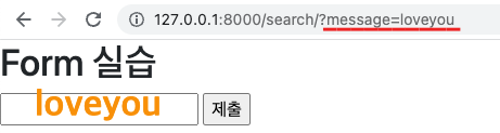 ⎣ 입력 후 URL : http://127.0.0.1:8000/search/?message=loveyou