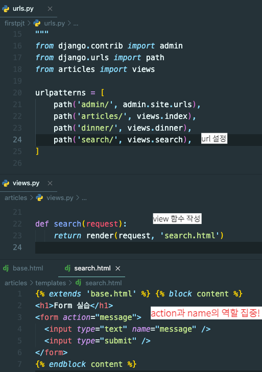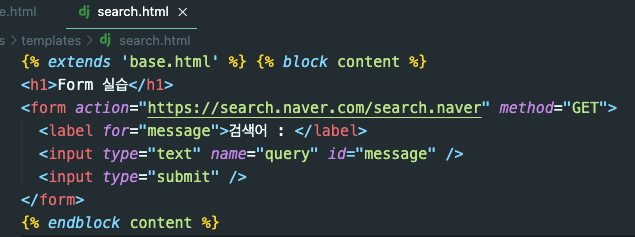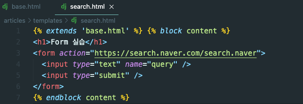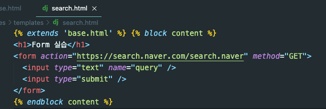 ⎣ search.html 파일의 form태그 action과 input의 name부분에 집중해서 보기(url 변화)