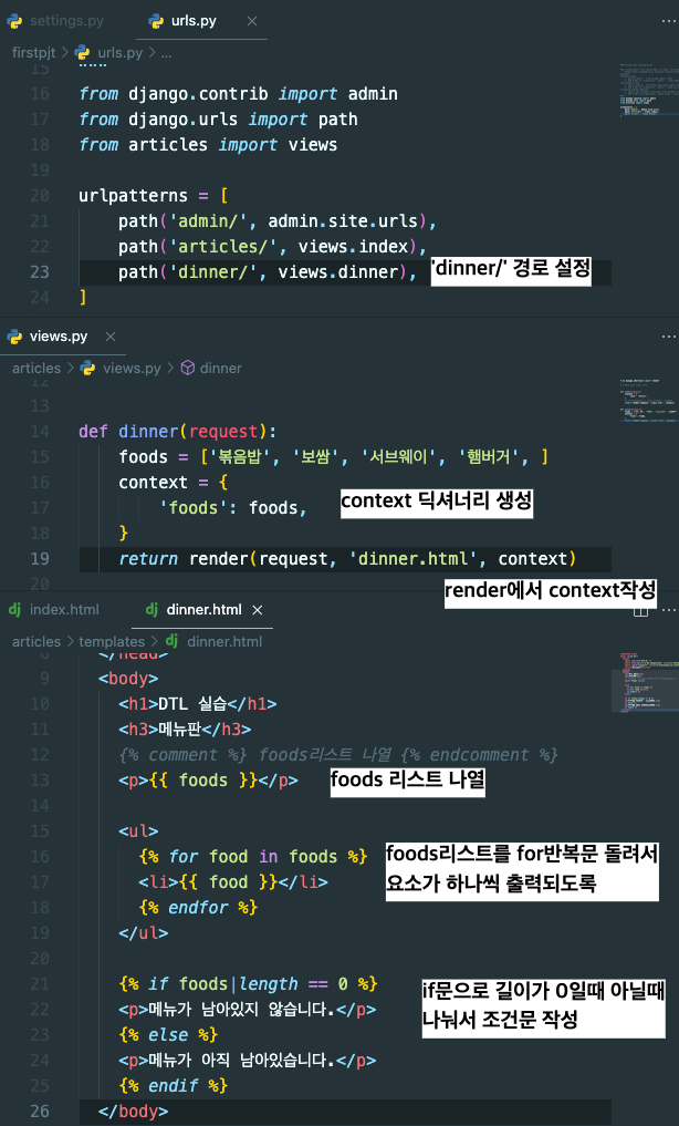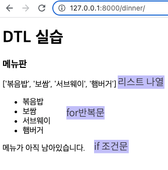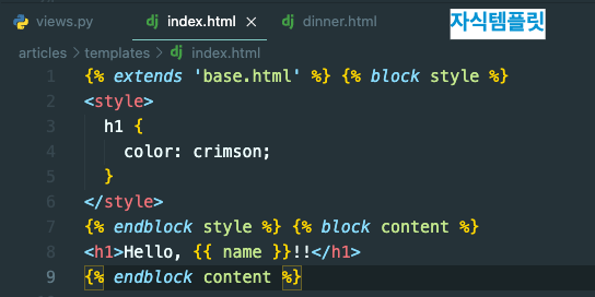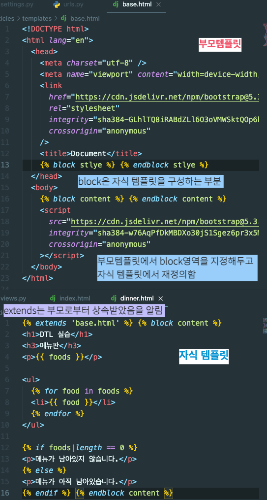 - base.html 이 부모템플릿이 되어 dinner.html, index.html 자식 템플릿에 상속을 해준다