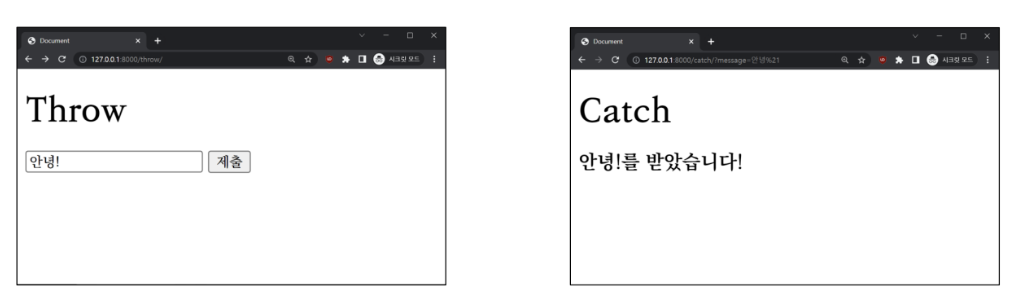 - django는 /throw/ 주소에 맞는 throw 뷰함수를 호출(응답)