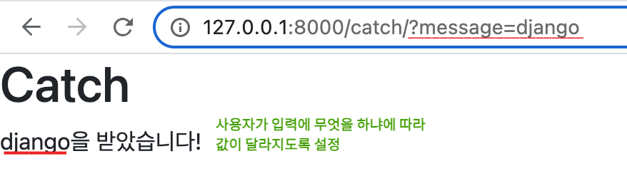 - django는 /catch/ 주소에 맞는 catch 뷰함수를 호출(응답)