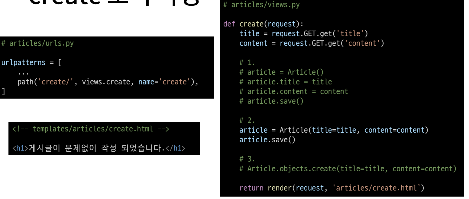 - create : 사용자가 입력한 데이터를 받아 DB에 저장