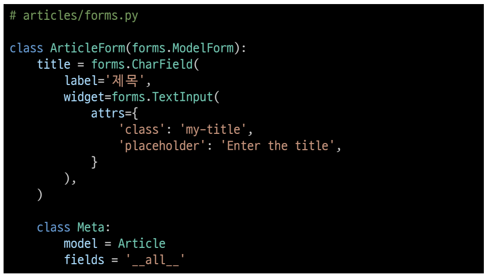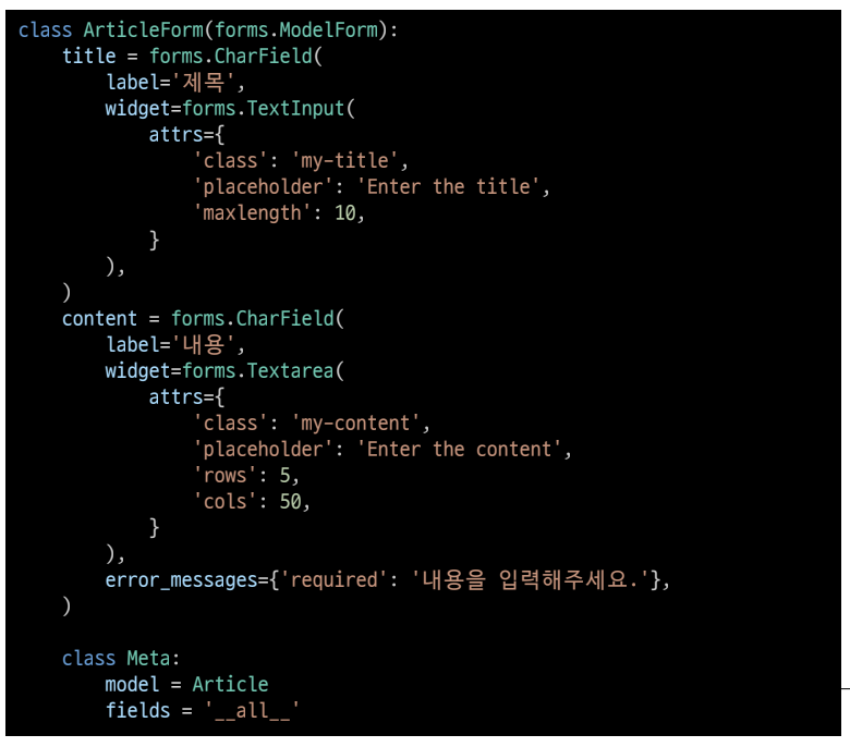 # 기존 ArticleForm 클래스 수정