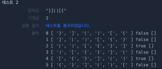 반복문안에 반복문에서 if조건문을 살펴볼 때 (, {, [ 중 하나가 등장하면 stack 배열에 push 하고
