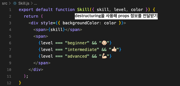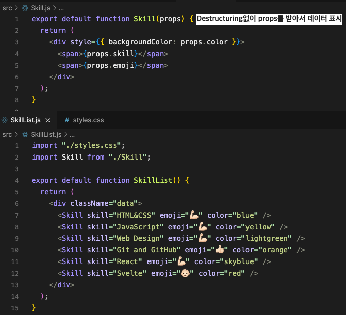#challenge1, 2 props를 받아오는 방법이 다르지만 결과는 동일하다.