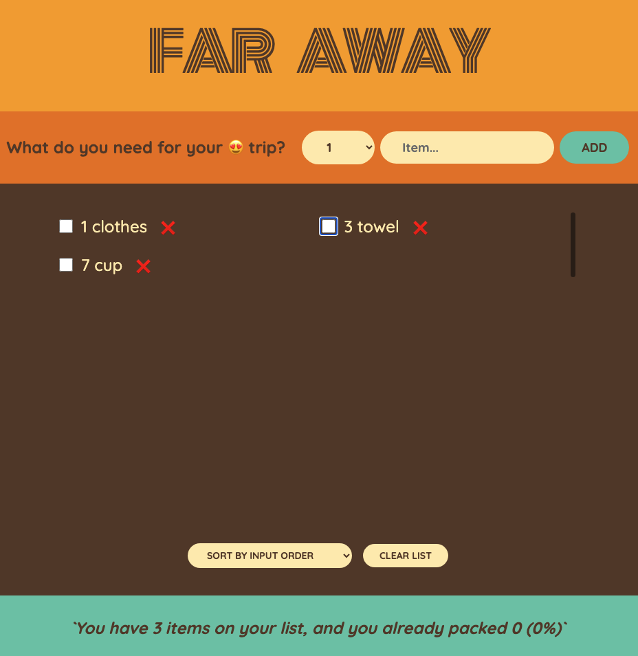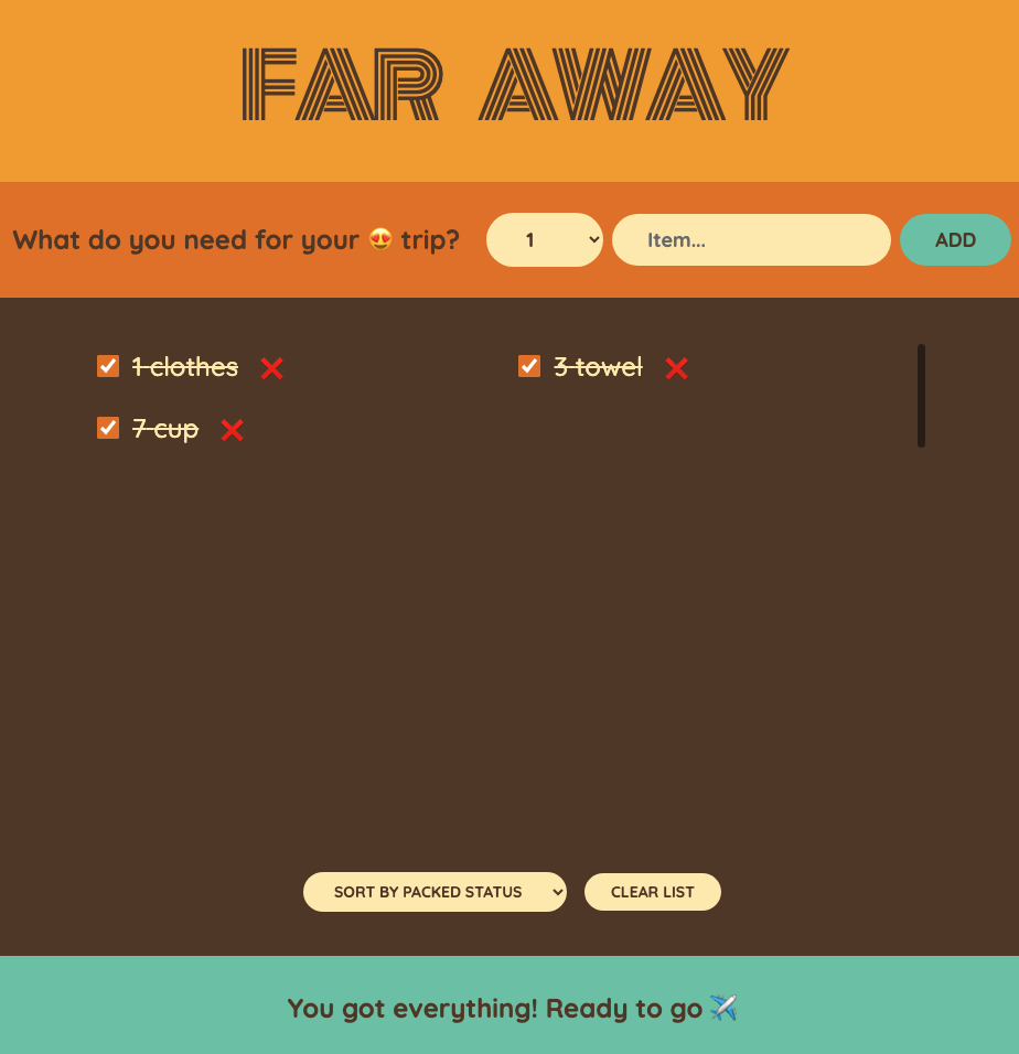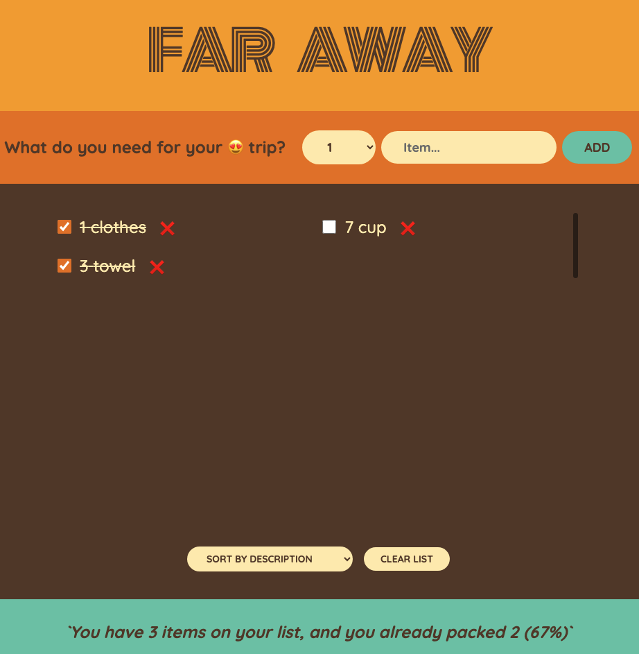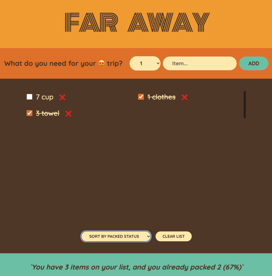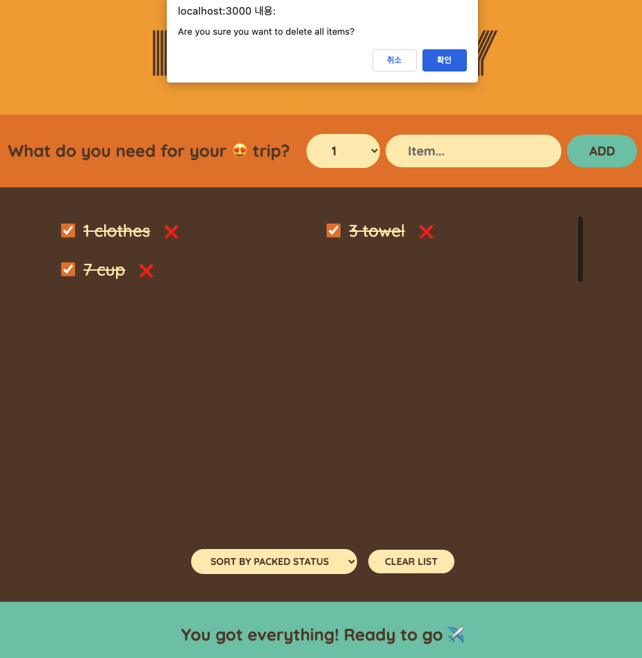 - Packinglist 컴포넌트에서는 Form에서 입력받은 정보들을 목록 형태로 화면에 출력하며, 이를 더 가독성 있게 표현하기 위해 Item 컴포넌트를 도입했다. 또한 정렬 기능을 추가하여 사용자가 원하는 방식으로 목록을 정리할 수 있도록 했다. 더불어, 전체 목록을 한 번에 삭제할 수 있는 기능도 구현했다.