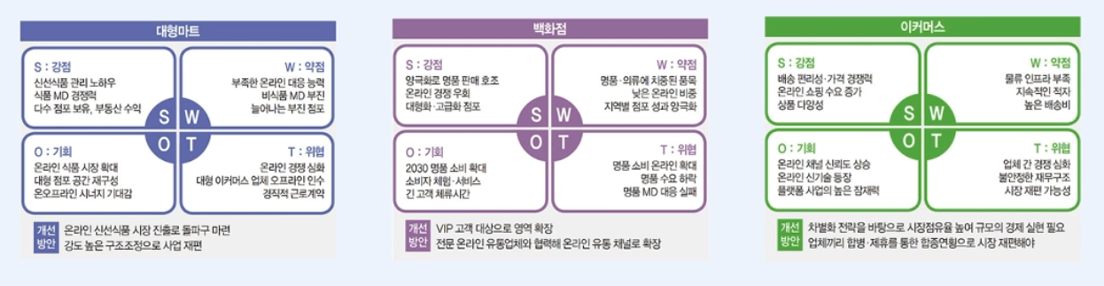 | 기회(O) | SO전략(발전형전략) - 외부환경의 강점과 내부 기회를 파악해서 업계의 발전 속도를 좀 가속화하는 전략 | WO전략(전환형전략) - 외부의 기회를 이용해 내부 요익의 약점을 보완하는 것으로, 약점을 강점으로 바꾸는 전략 |