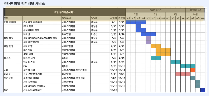 | 핵심 결과 | - 과일 수입이 원활하도록 농작 10곳과 계약 성사하기 - 고객이 원하는 계절별 과일 종류 파악하기 - 새벽배송이 가능한 택배사 도입하기 |