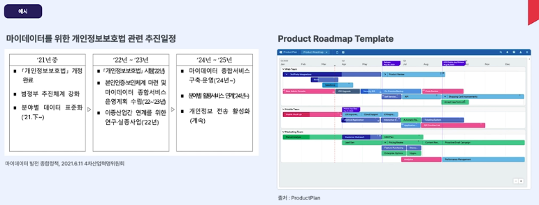 - 시간 경과에 따라서 제품/서비스 또는 팀의 비전, 방향, 우선순위에 따라 제품/서비스가 앞으로 어떻게 진행될 것인지 나타내는 문서