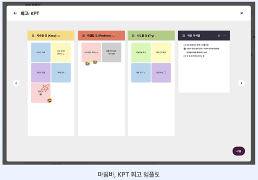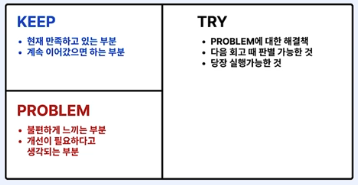 - Keep, Problem, Try의 약자로 회고 내용을 세 가지 관점으로 분류하고 회고를 진행하는 것이 특징