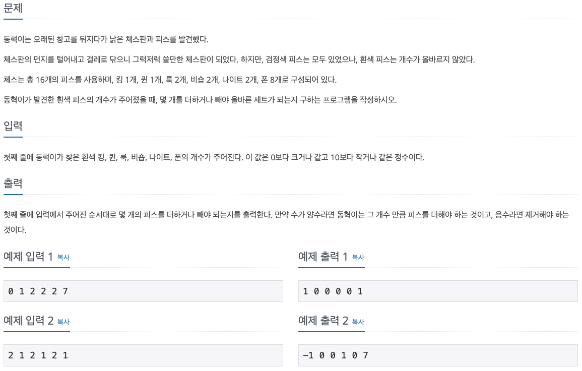 첫째 줄에 동혁이가 찾은 흰색 킹, 퀸, 룩, 비숍, 나이트, 폰의 개수가 주어진다. 이 값은 0보다 크거나 같고 10보다 작거나 같은 정수이다.