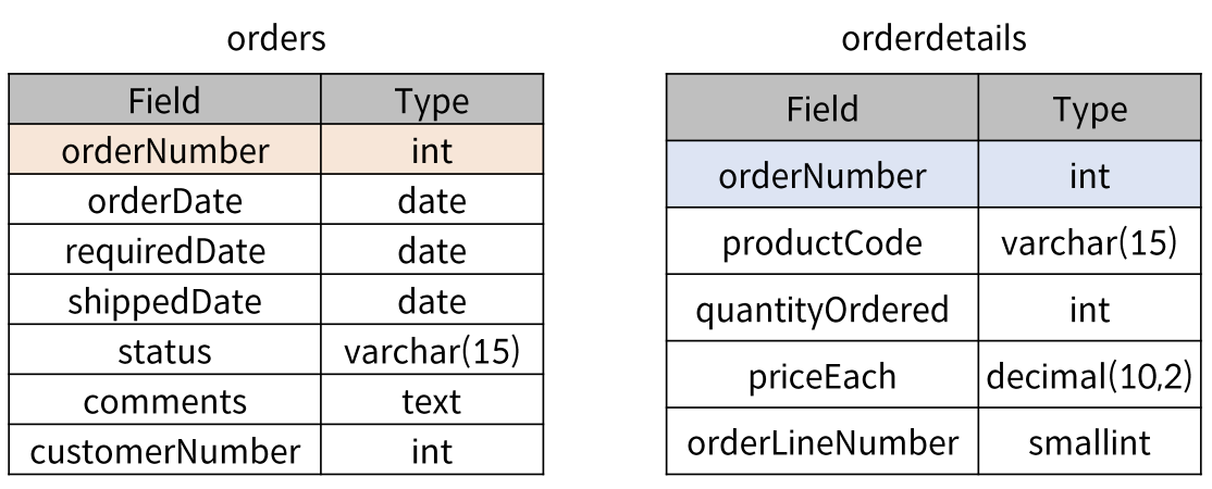 ➁ 제시된 두 테이블을 참고하여 orderNumber 값이 같은 레코드의 orders 테이블 orderNumber, status 필드를 조회
