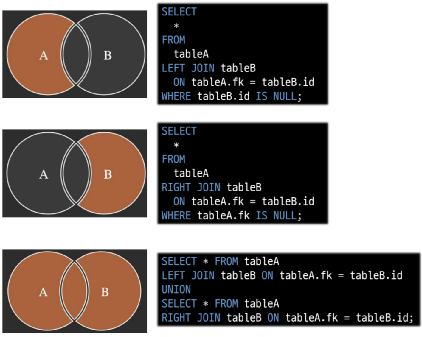 - RIGHT JOIN 왼쪽 테이블의 일치하는 레코드와 함께 오른쪽 테이블의 모든 레코드 반환 (오른쪽 테이블 전체)