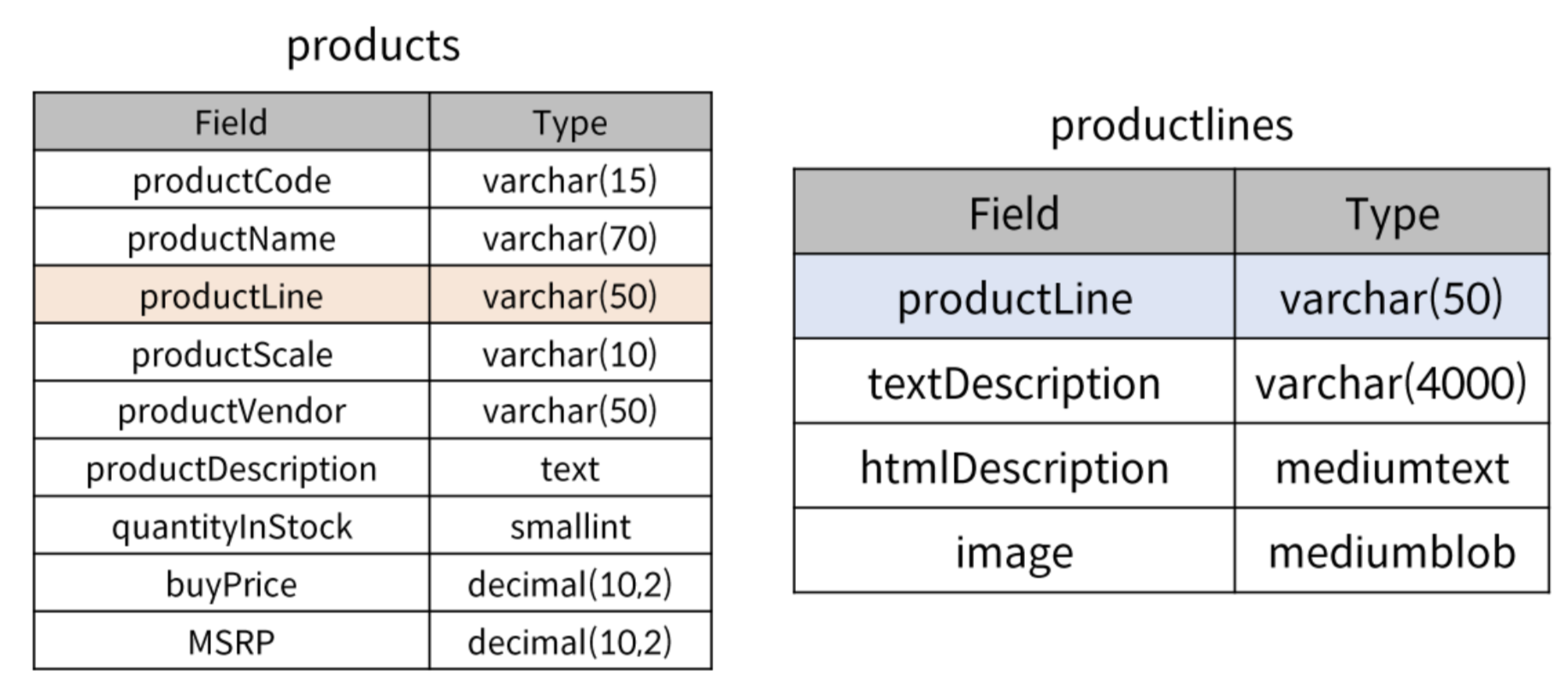 ➀ 제시된 두 테이블을 참고하여 productLine 값이 같은 레코드의 productCode, productName 필드를 조회