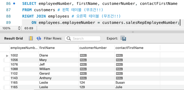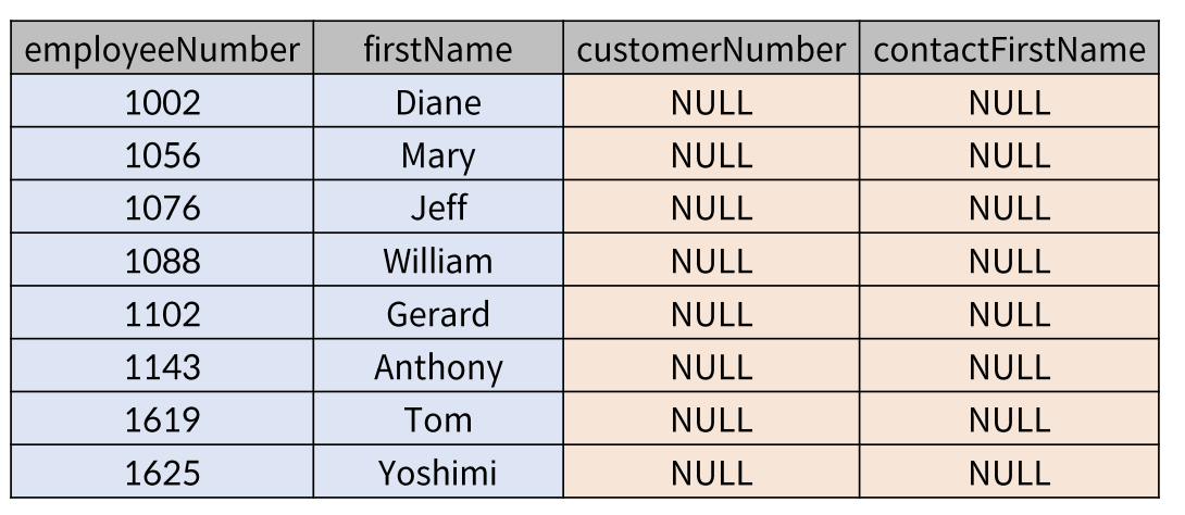 ➀ 제시된 두 테이블을 참고하여 employees를 기준으로 employeeNumber 필드와 salesRepEmployeeNumber 필드가 일치하는 레코드와 함께 employeeNumber, firstName, customerNumber, contactFirstName 필드 조회(왼쪽 테이블은 customers, 오른쪽 테이블은 employees, 일치하는 않는 경우 NULL)