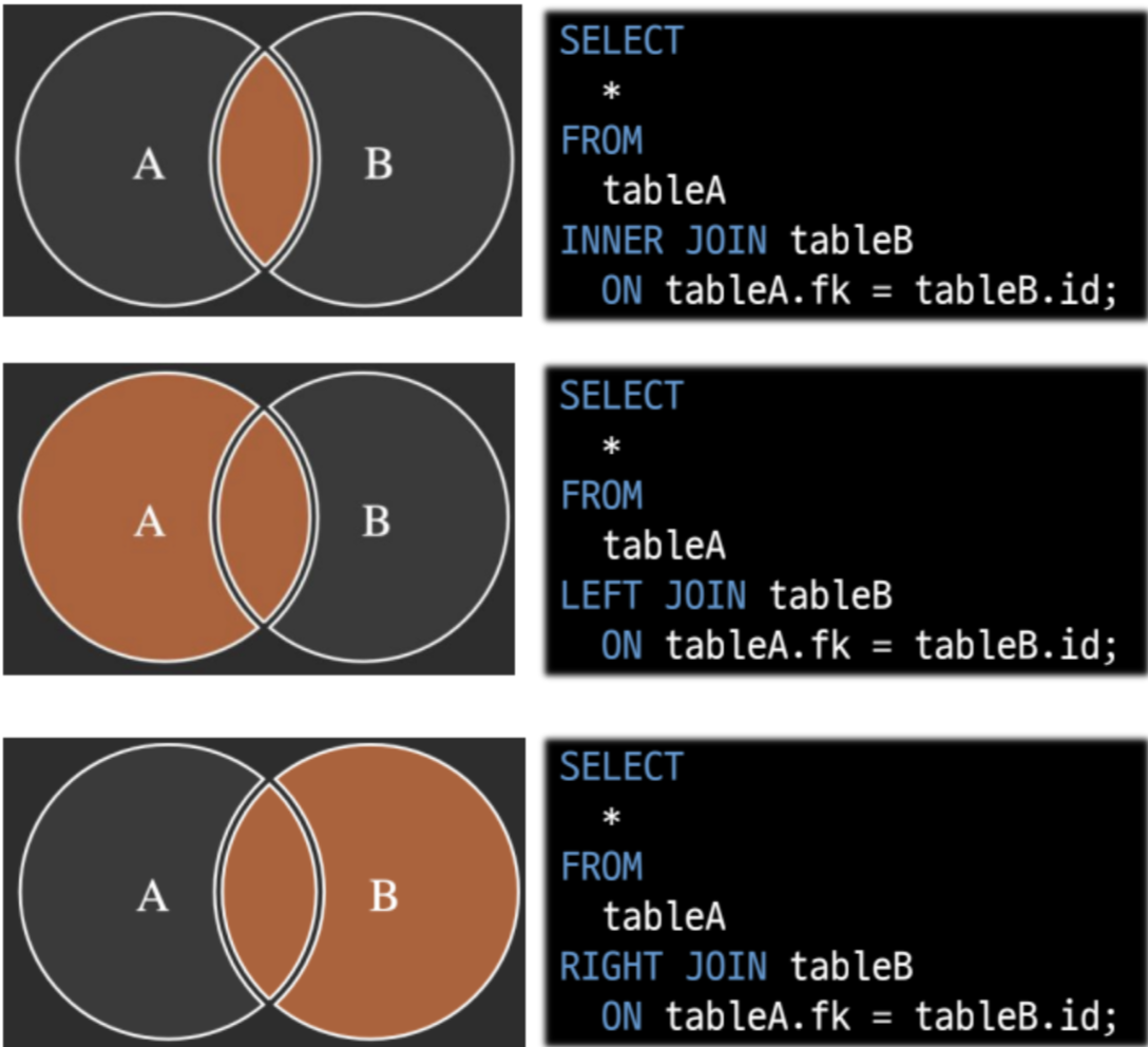 - INNER JOIN 두 테이블에서 값이 일치하는 레코드에 대해서만 결과를 반환 (교집합)