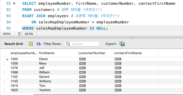- 왼쪽은 무조건 표시하고, 매치되는 레코드가 없으면 NULL 표시