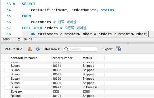 ➁ 직전 조회 결과를 바탕으로 주문내역이 없는 고객의 이름과 주문번호 및 배송상태 조회(고객의 이름은 contactFirstName 필드, 주문번호는 orderNumber, 배송상태는 status 필드)