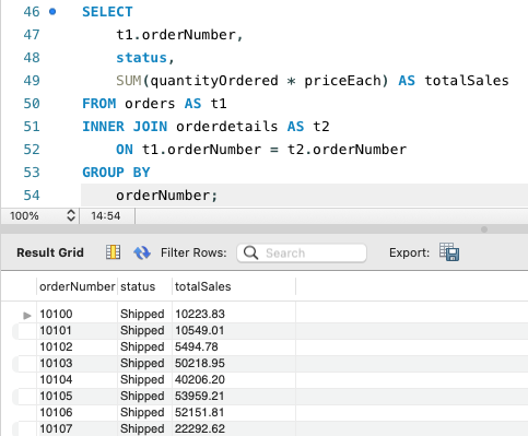 ➂ 직전 조회 결과를 바탕으로 각 주문번호 별 주문상태와 총판매액을 요약(주문번호는 orderNumber 필드, 총판매액은 quantityOrdered와 priceEach필드의 곱셈 결과)