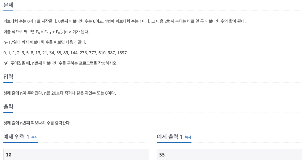 피보나치 수는 0과 1로 시작한다. 0번째 피보나치 수는 0이고, 1번째 피보나치 수는 1이다. 그 다음 2번째 부터는 바로 앞 두 피보나치 수의 합이 된다. 이를 식으로 써보면 Fn = Fn-1 + Fn-2 (n ≥ 2)가