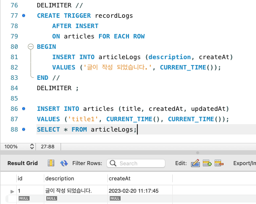 - 트리거를 사용해 기존 게시글이 수정되면, 게시글의 수정일자 필드 값을 최신 일자로 업데이트하기
