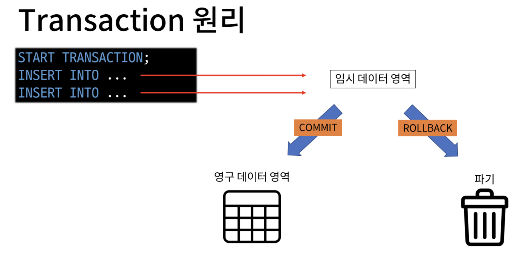 - (다 성공하던지 혹은 다 실패하던지 해야 하는) 여러 쿼리문을 묶어서 하나의 작업처럼 처리하는 방법